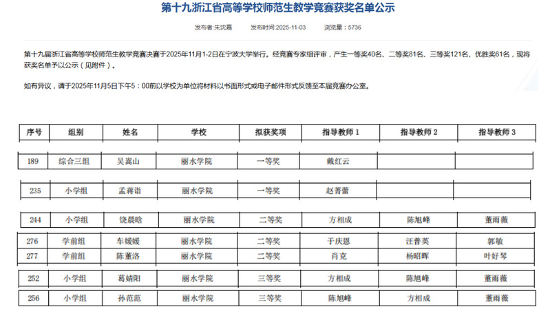 近日,第十九届浙江省高等学校师范生教学竞赛决赛在宁波大学落下帷幕。经过激烈角逐,我院学生与来自浙江师范大学、杭州师范大学、宁波大学等省内多所院校的师范生同台竞技,最终获得一等奖2项,二等奖3项,三等奖2项的好成绩。