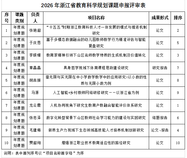 根据教师自主申报,经校外专家评审,现将教师教育学院2026年浙江省教育科学规划课题申报评审推荐结果进行公示。