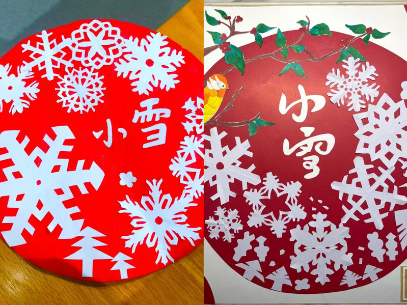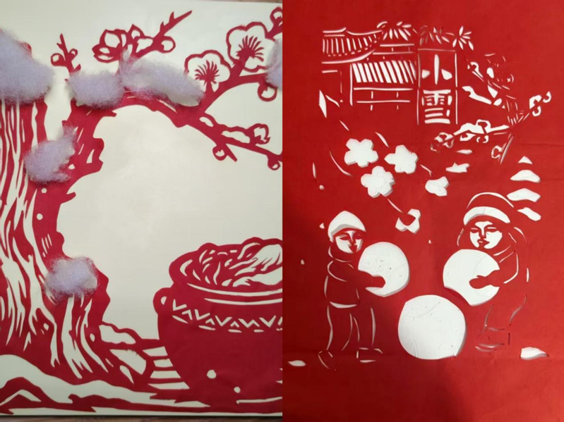 本次比赛鼓励学生围绕二十四节气——“小雪”进行创作,作品需体现初雪、寒梅、腌菜等节气元素,兼具传统美学与现代创意。参赛者通过剪纸、刻纸等手法,将冬日的静谧与温馨凝聚于方寸之间。活动共收到数十件原创作品,每一幅都凝聚了同学们的巧思与深情。