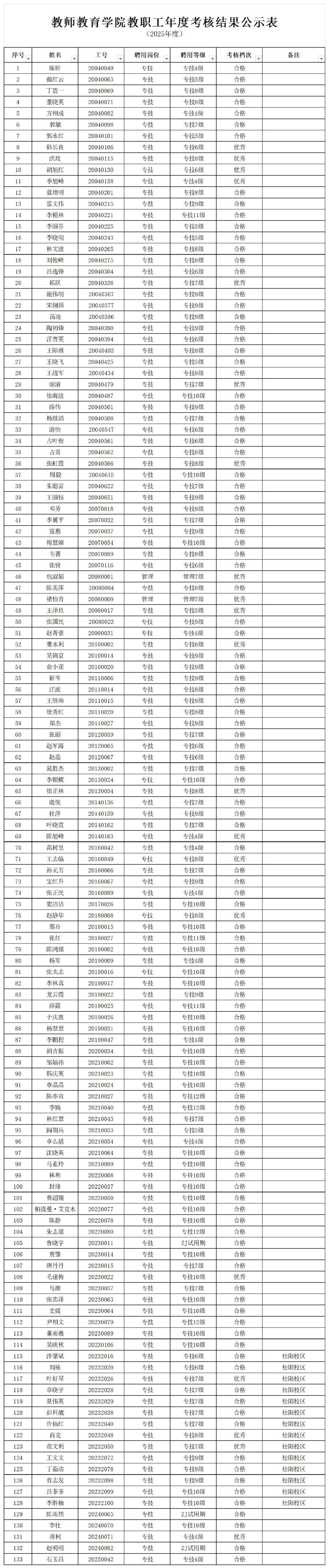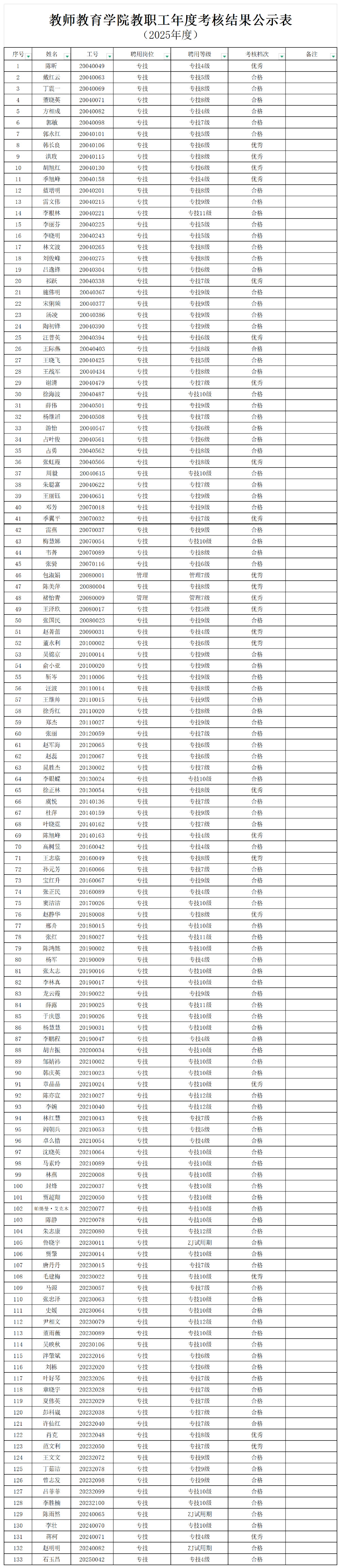 根据学校《关于做好2025年教职工年度考核工作的通知》要求,经考核工作领导小组成员集体表决,投票确定全体教职工的考核情况,现将2025年教师教育学院年度考核结果进行公示。