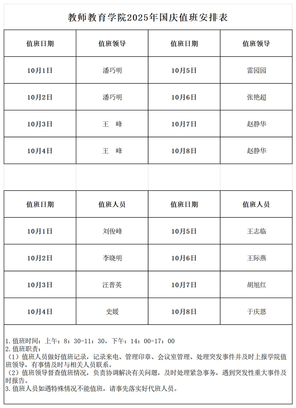 教师教育学院2025年国庆值班安排