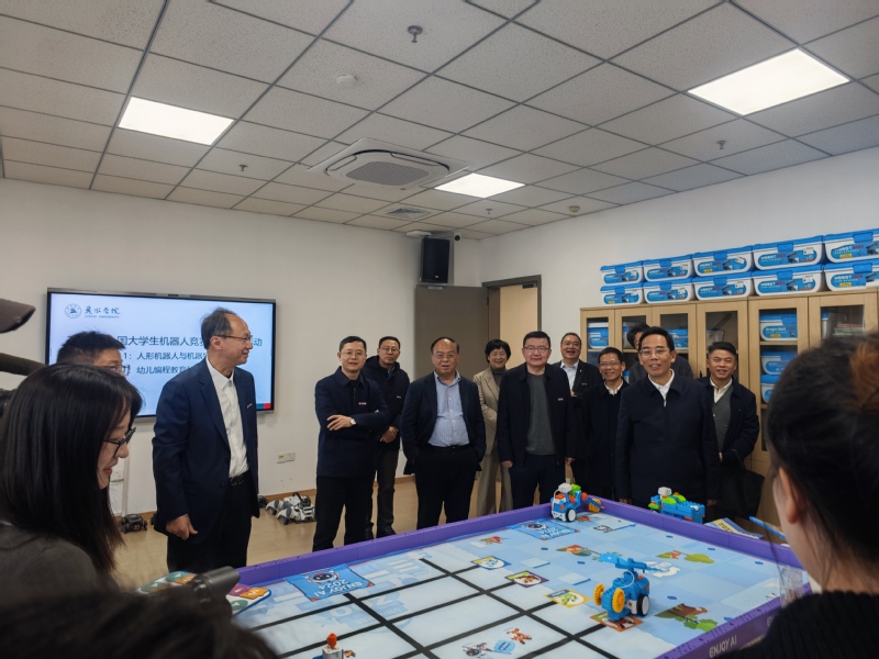 潘巧明院长向吴书记汇报了“人工智能与未来教育创新实验室”的建设历程与发展成效:实验室自创建以来,经历了智慧教室平台建设、仿真实训平台系统升级等重要阶段,于2023年建成集“AI+STEM教育”“智能语言实训”“XR沉浸教学”“微格教学”“虚拟仿真”等16个特色平台于一体的综合性教育创新中心,全面赋能教育教学改革与职业技能训练。