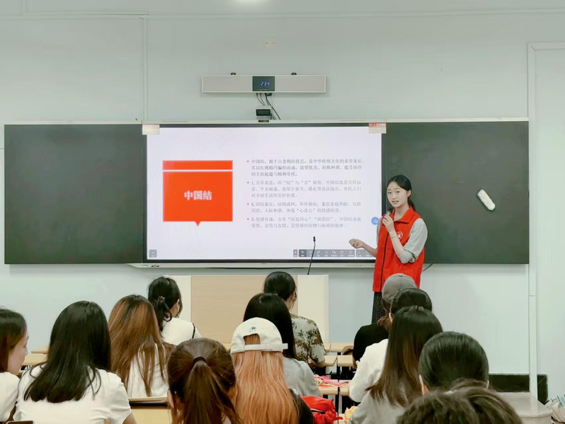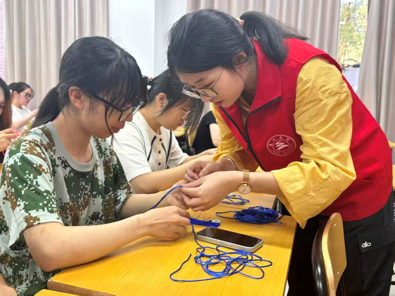 活动现场,志愿者通过“分步示范”与“要点口诀”相结合的方式,细致讲授盘长结、双钱结等经典结型的编织技法,并穿梭于学员之间进行一对一指导,及时纠正操作手势。志愿者还结合实物样品,为同学们解读了绳结文化中“同心同德”“吉祥如意”等美好寓意,深化了大家对中国结文化内涵的理解。