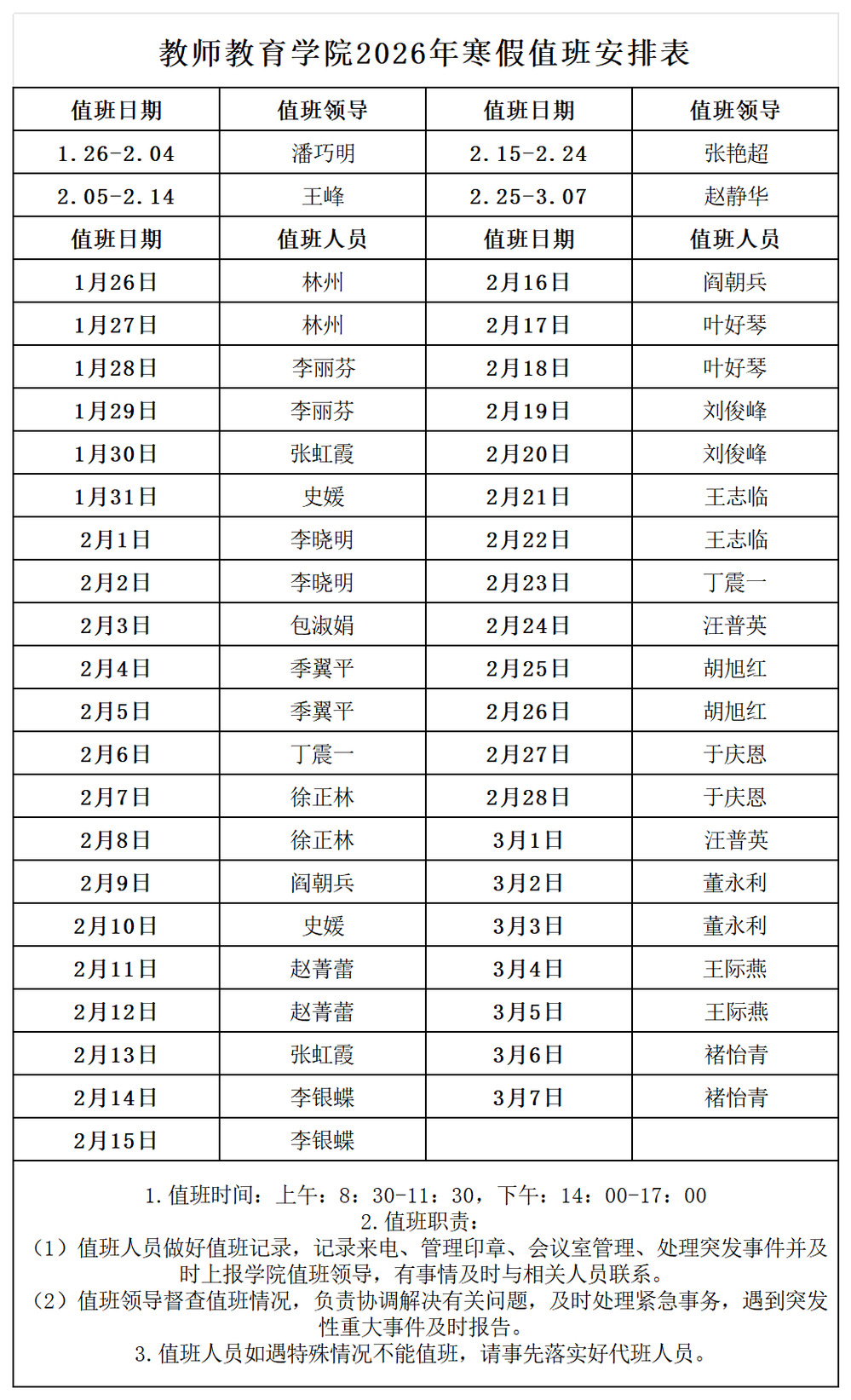 教师教育学院2026年寒假值班安排