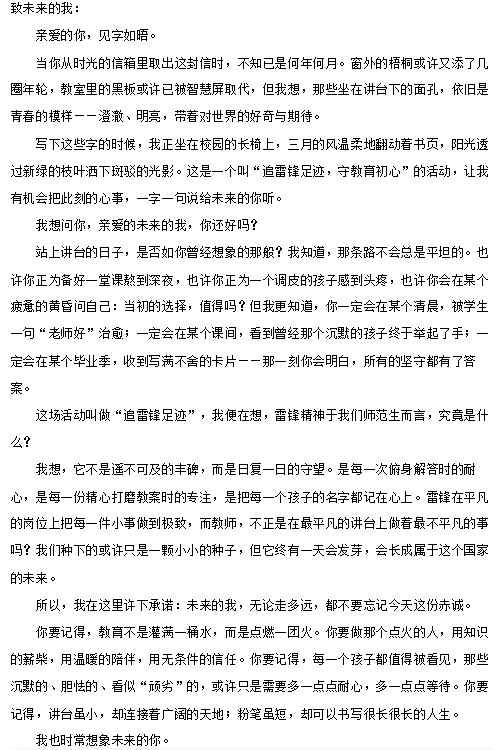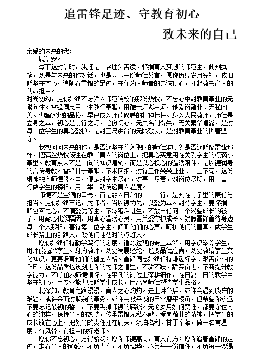 活动以线上“时空信箱”为主要形式,组织学生撰写“师德信”。同学们将雷锋精神融入对教师职业的思考中,在信里写下自己选择师范专业的初衷,希望为学生带去温暖与力量;结合心理学与生涯规划知识,回顾自身学习经历,设想未来站在讲台上的模样。字里行间流露出对教育事业的敬畏,对学生的关怀,以及对自身成长的期许——既要做爱岗敬业的教书人,也要做传递温暖的教育者。完成创作后,书信由参与者自行保管,珍藏至2030年再开启,届时对照初心,审视自身职业成长轨迹。