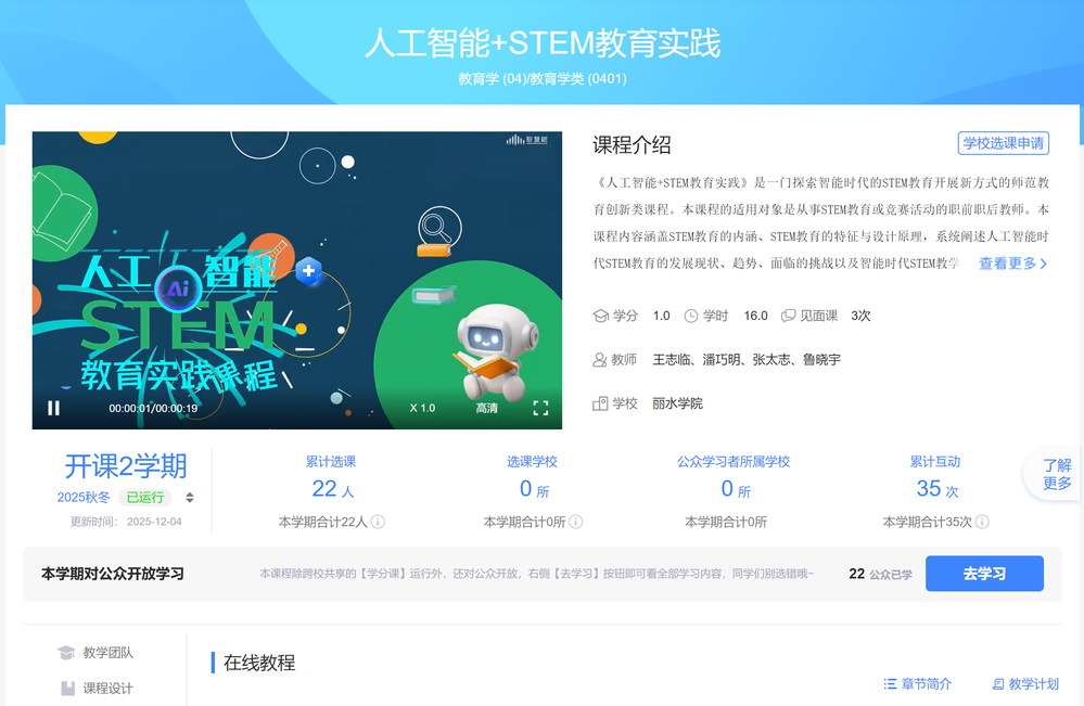通过项目活动的持续开展,最终确定了“人工智能+”stem教育实践课程的课程目录,明确了该课程是一门探索智能时代的STEM教育开展新方式的师范教育创新类课程。本课程拟新建一门适用于从事STEM教学或竞赛活动的职前职后教师的课程。通过项目成员的共同努力,“人工智能+”stem教育实践课程共撰写了31个知识点教学讲稿,31个知识点的教学课件资料,撰写教材文字材料5万多字,收集相关教学案例28个。各课程章节测验题共150道。该课程已于2025年9月正式上线智慧树网课程平台,并作为教师教育学院微专业“人工智能与未来教师”的课程之一面向全社会进行招生。